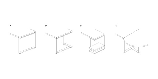 The “L” shaped version for operational desks can be provided with a shelf to house a CPU (C). The “T” shaped leg is used on desks, meeting tables and half moon extensions.