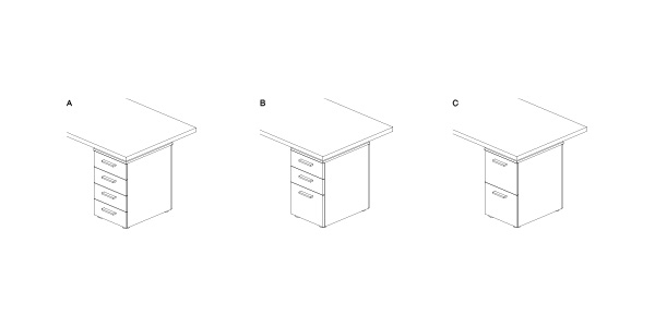 Desks are also available with a melamine-faced structural drawer pack with four shallow drawers, (A), two shallow drawers and a filing drawer (B) or two filing drawers (C):