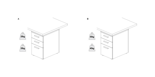 30 kg per pair for drawers and 40 kg per pair for filing units (B).