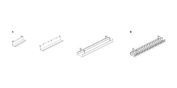 Desks and meeting tables can be supplied with a metal section wire management tray (A) or one in steel rod (B), secured to the top.